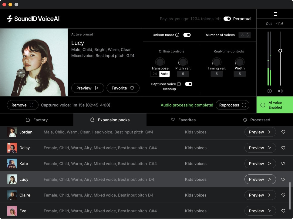 そしてすべてのVoiceAIプリセットは著作権制限がありません。Sonarworksは、お客様の作成したコンテンツに対していかなる権利も主張しません。Sonarworksのクライアントとして、お客様は生成されたオーディオデータの完全な所有権を保持し、商用・非商用の両方の目的で自由に作品を使用することができます。