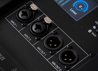 各スピーカーには、コンボマイク/ライン入力、AUXサポート、TWSブリッジモード付き内蔵Bluetoothを備えたオンボードミキサーが含まれており、追加のギアやケーブルは必要ありません。