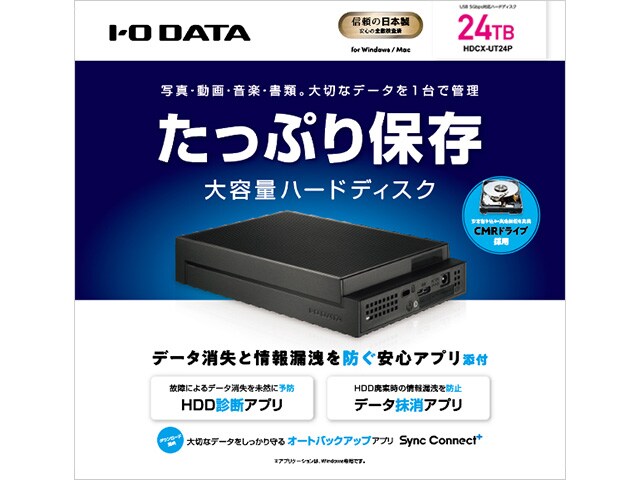 高性能なCMRドライブ を採用しており、大量ファイルのコピーでも安定した書き込み性能があります。定期診断ができる「診断ミレル」や、強力なデータ消去アプリ「DiskRefresher5 SE」、バックアップ/移行用アプリも付属。縦置き・横置きが選べて省スペースにも対応し、PCの電源ON/OFF連動機能も搭載。熱・振動対策のデザインで静かかつ信頼性の高い据え置きHDDです。