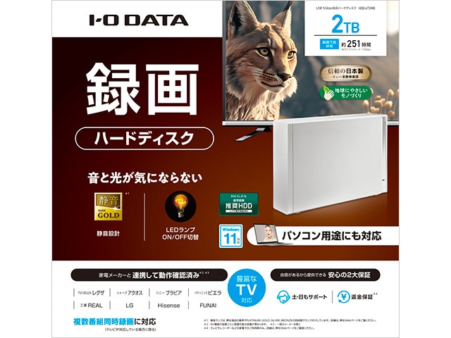 USB 5 Gbps(USB 3.2 Gen1)接続で、テレビ録画にもパソコンにも対応できる静音仕様の据え置きHDD。縦置き・横置きどちらでも設置可能で、テレビやPCの電源と連動して自動スタンバイする「電源連動機能」を搭載。書き込み速度は前モデル比で約1.2倍速く、録画時間の目安も大容量で、4K録画にも対応。LED ランプの明るさをOFFにもできるので、寝室など光が気になる場所でも使いやすい、実用性の高い外付HDDです。
