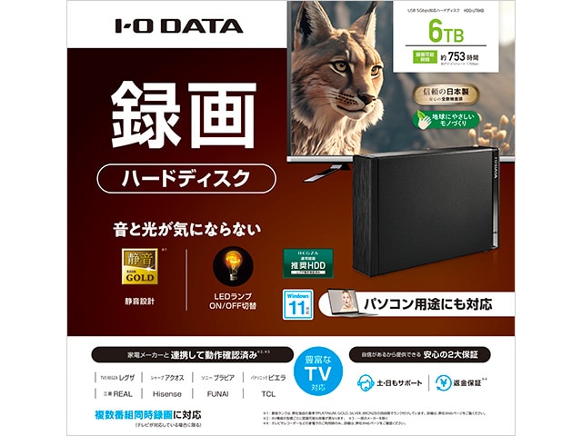 USB 5 Gbps(USB 3.2 Gen1)接続で、テレビ録画にもパソコンにも対応できる静音仕様の据え置きHDD。縦置き・横置きどちらでも設置可能で、テレビやPCの電源と連動して自動スタンバイする「電源連動機能」を搭載。書き込み速度は前モデル比で約1.2倍速く、録画時間の目安も大容量で、4K録画にも対応。LED ランプの明るさをOFFにもできるので、寝室など光が気になる場所でも使いやすい、実用性の高い外付HDDです。