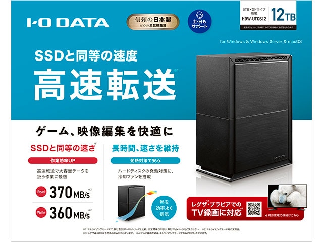 2ドライブ搭載&RAID 0/1対応で、ゲーム録画・動画編集・テレビ録画まで幅広く使える据え置き外付けHDD。USB 3.2 Gen 1(USB 3.0)対応で読み込み約370 MB/s・書き込み約360 MB/sを実現し、SSDに匹敵する高速転送を発揮。冷却ファン&エアフロー構造も備え、長時間稼働でも安心。テレビ録画にも対応し、大容量データをたっぷり扱いたい方・安心の保存体制を整えたい方におすすめです。