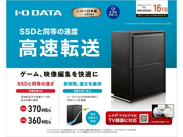 2ドライブ搭載&RAID 0/1対応で、ゲーム録画・動画編集・テレビ録画まで幅広く使える据え置き外付けHDD。USB 3.2 Gen 1(USB 3.0)対応で読み込み約370 MB/s・書き込み約360 MB/sを実現し、SSDに匹敵する高速転送を発揮。冷却ファン&エアフロー構造も備え、長時間稼働でも安心。テレビ録画にも対応し、大容量データをたっぷり扱いたい方・安心の保存体制を整えたい方におすすめです。