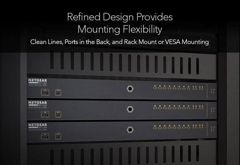 1U ラックマウント対応 (キット付属)、前面ブラックディスプレイパネル、背面に全ポートを装備。前面にポートが来るように逆取付も可能。