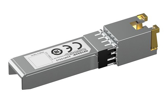 NETGEARR 10GBASE-T SFP+モジュール (AXM765) は、スイッチのSFP+スロットに挿入すると、CAT6aケーブルで最大80mの10Gカッパー接続を提供します。(※AXM765-20000Sのみ。AXM765-10000Sは最大30m)