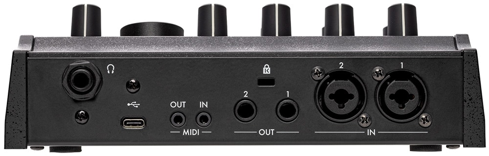 IN 1、2端子 (XLR / 6.3mmTRSモノラルフォーンジャック)、OUT 1、2端子 (6.3mmTRSモノラルフォーンジャック)、MIDI IN端子、MIDI OUT端子(3.5mmTRSフォーンジャック)、USB端子(Type-C)、ヘッドホン端子 (6.3mmステレオフォーンジャック)