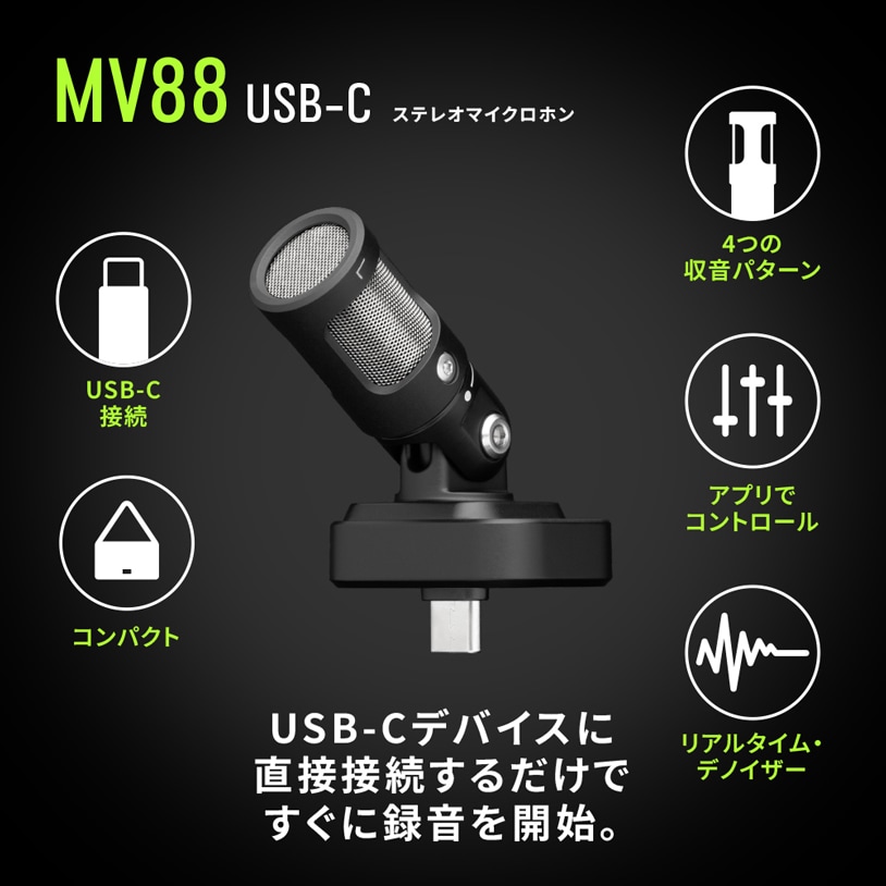 繋ぐだけですぐに使えるマイク、MV88がMOTIVシリーズに復活しました。USB-C端子を搭載し、USB-C対応のモバイルデバイスに瞬時に接続できます。スマートフォンでの音声収録を新しいレベルに引き上げる準備はいいですか?MV88なら、即座にプロレベルの音質を実現できます。
