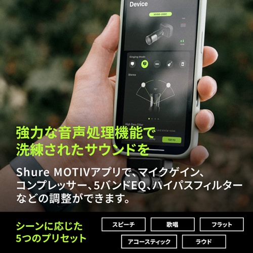 このマイクは箱から取り出して接続するだけでも十分に性能を発揮します。さらに音質を微調整して洗練させたいときのために、マイクゲイン、ハイパスフィルター、リミッター、コンプレッサー、5バンドEQなどの幅広い内蔵オーディオ処理機能が搭載されており、録音シーンに応じた5つのプリセットも用意されています。