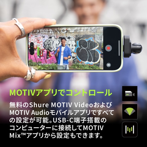 無料のShure MOTIV VideoおよびMOTIV Audioモバイルアプリは、MV88のすべての設定を行うための鍵となります。iOSの場合はApp Store、Androidの場合はGoogle Playからアプリをダウンロードしてください。また、USB-C端子を搭載したコンピューターに接続してMOTIV Mixアプリからマイクの設定を行うこともできます。