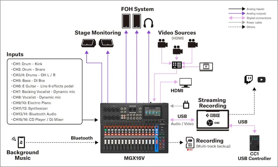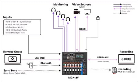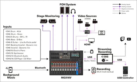 MGX16Vはプロフェッショナルミキサーに求められる基本性能と高い汎用性に加えて、HDMI-USBオーディオ/ビデオインターフェースを統合し、キャプチャおよびパススルー機能を搭載しています。これにより、さまざまなオーディオ出力だけでなく、PCへ映像を同時にキャプチャし、オーディオとともに録画・配信することも可能になります。