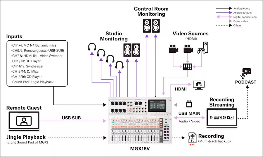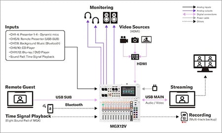 MGX-Vモデルは、高度なHDMI-USBキャプチャー機能とHDMIパススルー機能を搭載しており、映像をビデオ制作や配信環境へシームレスに取り込むことができます。この強力な統合により、PAやモニター用音声を管理しつつ、映像と音声の配信や収録にも対応するコンパクトなシステムを構築できます。小規模なハイブリッドライブイベントから、ポッドキャストやライブ配信、映像コンテンツ制作まで、幅広い用途に最適です。
