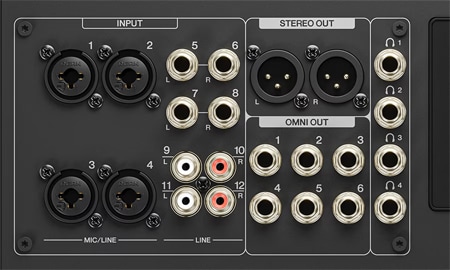 MGX12は、4基のプレミアム品質MGXマイクプリアンプを備えたMic/Lineコンボ入力に加え、8系統のライン入力、2系統のXLRアウト、6系統のTRSのOMNIアウト、4系統のヘッドホン端子を搭載し、スムーズなコラボレーションと多彩なモニタリングを可能にします。