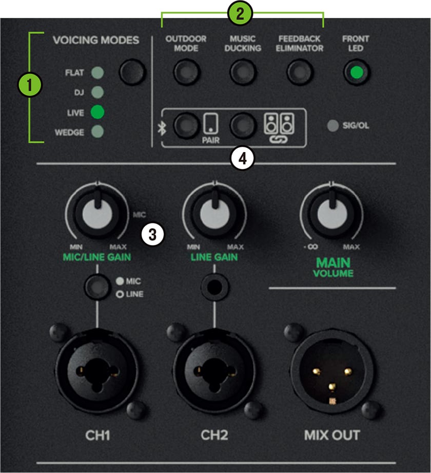 SoundCheck DSP™搭載で、ボタン一つでサウンドチェックが可能。あらゆる用途に対応するボイシングモードに加え、ミュージックダッキング、フィードバックエリミネーター、アウトドアモードによる瞬時のセットアップも実現します。