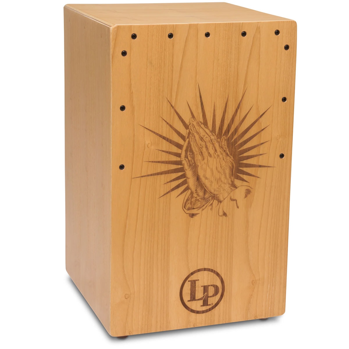 LP(ラテンパーカッション)のカホン。ホワイトネマボディとサウンドボードにレーザー刻印された祈りの手デザインが特徴。内蔵スネアワイヤーによりスラップがクリアで、統合バスポートが豊かな低音域を生み出します。礼拝やライブ演奏に最適な一台です。
