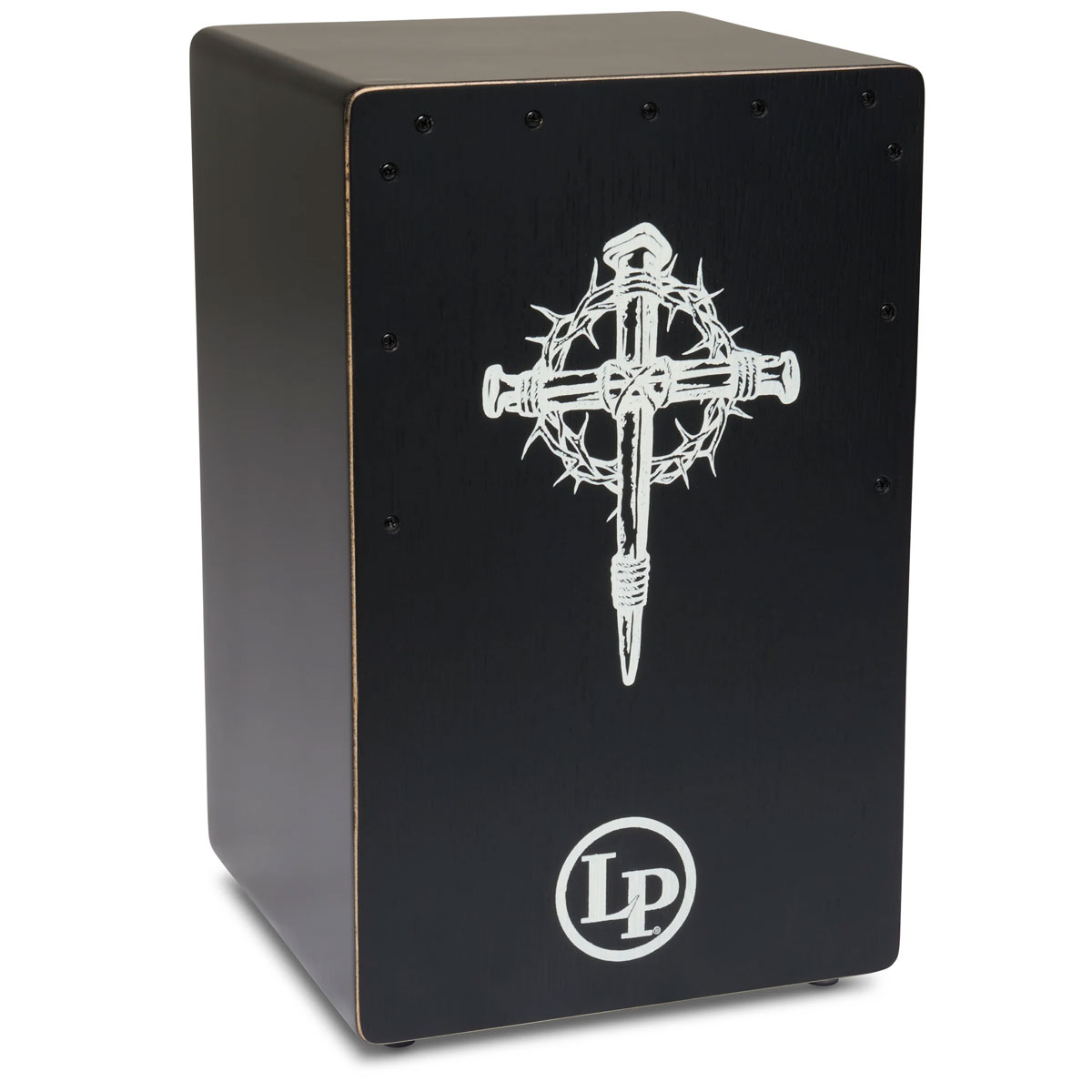 LP(ラテンパーカッション)のカホン。メランチサウンドボードにレーザー刻印されたトゲ付き十字架デザインが特徴。内蔵スネアワイヤーによりスラップがクリアで、統合バスポートが豊かな低音を生み出します。礼拝やライブ演奏に最適な一台です。