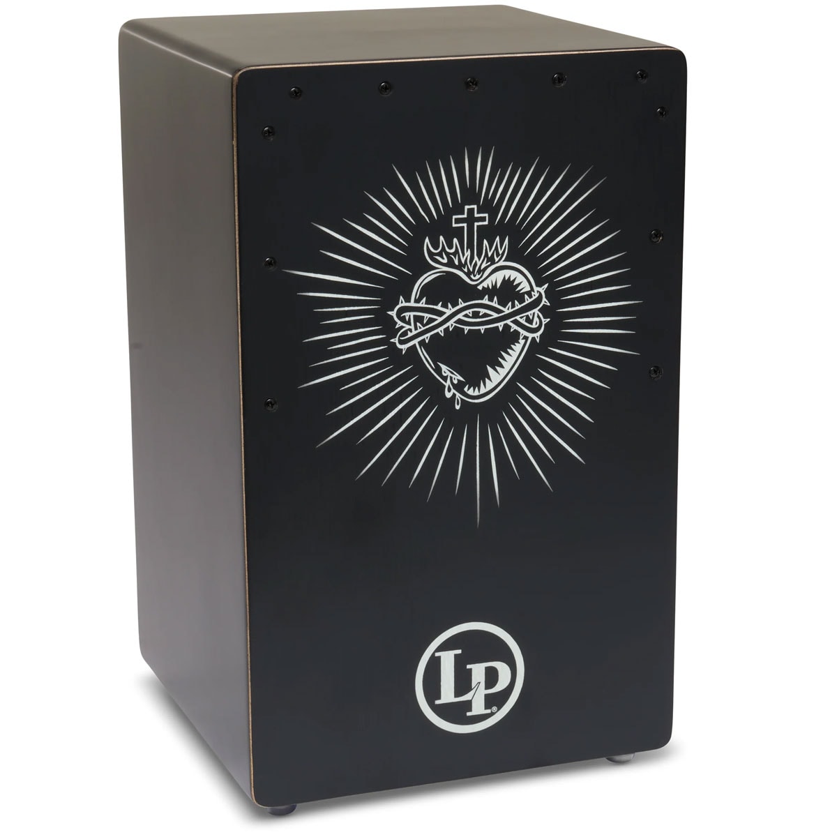 LP(ラテンパーカッション)のカホン。メランチサウンドボードにレーザー刻印されたトゲ付きハートデザインが特徴。内蔵スネアワイヤーによりスラップがクリアで、統合バスポートが豊かな低音を生み出します。礼拝やライブ演奏に最適な一台です。