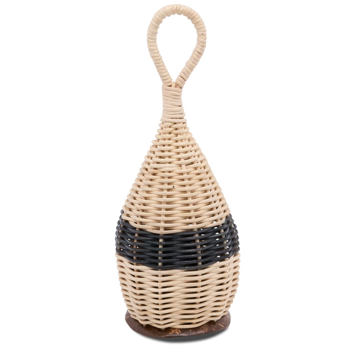 ブラジルの伝統的なカシシに基づいた手編みラタンバスケット。1つのラタンボディが内部の小石により乾いたクリスピーなサウンドを生成。ココナッツの底面を採用し、ループ付きハンドルで手持ちや設置が簡単。ナチュラル仕上げにブラックストライプを施し、見た目にも美しいデザインです。