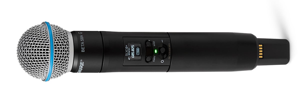 同梱物:SLXD4+ デジタルワイヤレス受信機×1、SLXD2+/B58 ハンドヘルド送信機 / BetaR 58A スーパーカーディオイド・ダイナミックマイクロホン×1、マイクロホン・クリップ×1、1/4波長アンテナ×2、ラックマウントキット×1、単3形乾電池×2、BNCケーブル×2、BNC変換コネクター×2、電源アダプター×1、ファスナー付きキャリングポーチ