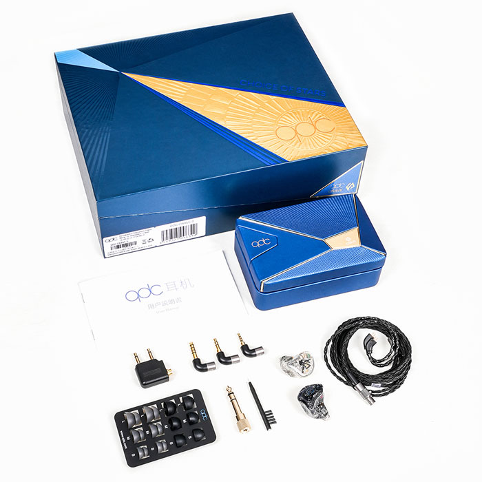 ■付属品:3in1マルチプラグ搭載ブラック被膜プレミアムケーブル、3.5mmアンバランス変換プラグ(L字)、2.5mmバランス変換プラグ(L字)、4.4mmバランス変換プラグ(L字)、3.5 to 6.35mm変換プラグ、qdcTips Soft-fitシリコンイヤーピース:3ペア(S/M/L)、シリコンダブルフランジイヤーピース:3ペア(S/M/L)、フライトアダプター、クリーニングツール、オリジナルキャリングケース
