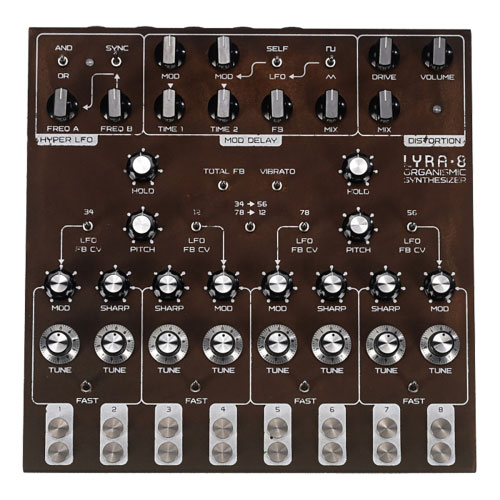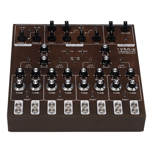 8チャンネルの音源を搭載したオーガニック・ドローン・シンセサイザーです。伝統的なシンセサイザーとは一線を画す特別な設計をしており、そのサウンドは美しいサウンド・スケープから荒々しい怪物の咆哮の様なサウンドまで独特な音世界を展開します。LYRA-8 は各チャンネルに用意された金属製タッチ・センサーに触れる事で演奏し、その触り方や演奏者のコンディションによりサウンドが有機的に変化します。