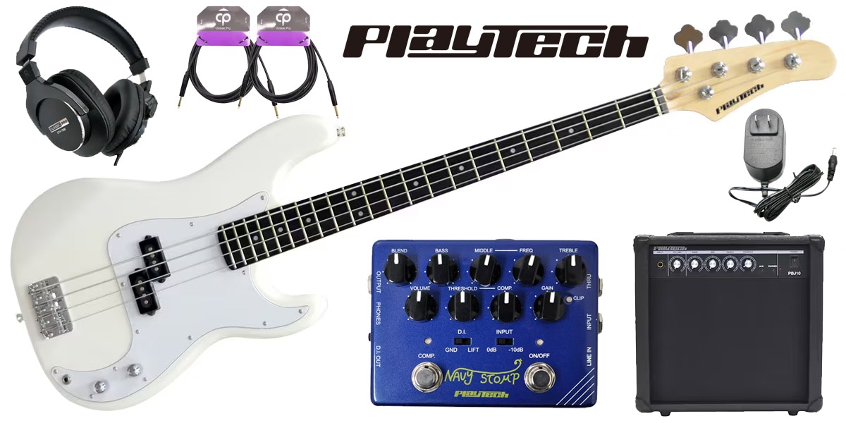 PLAYTECHベース、コンボアンプやアクセサリーが付いたお得なセット。Navy Stompは、宅録・ライブの環境を一変させる最強のベースプリアンプ!コンプ、ミッド可変3バンドEQで理想のサウンドを追求。DI、ヘッドフォン、ライン入力、アッテネーターも搭載し、あらゆるシチュエーションに対応します。初心者からプロまで、ベーシストの必携品。