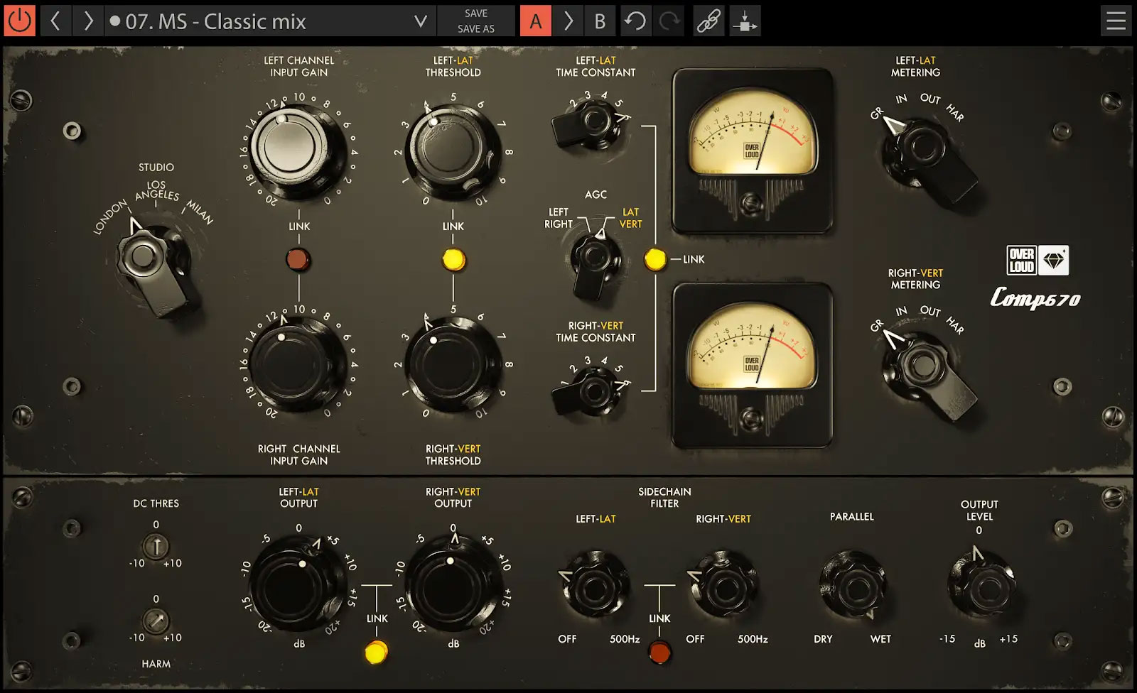 Comp670は、非常に希少な伝説の真空管コンプレッサーをOverloudが再現したものです。シグナルチェーンに多数のトランスフォーマーを搭載することで、非常に温かみのある独特のトーンを実現しています。