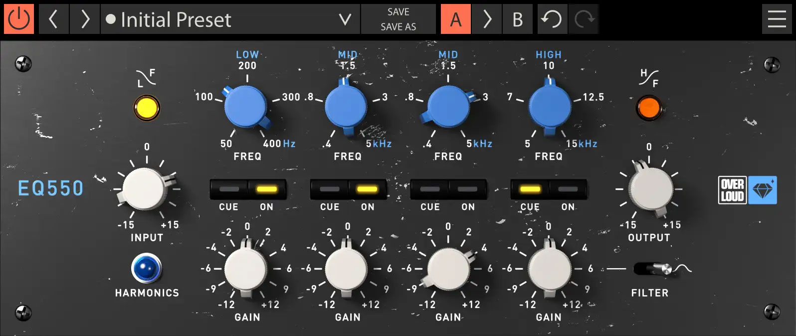 Overloud EQ550は、カスタムオペアンプを用いて作られた、著名なアメリカンEQをモデルにしています。プロポーショナルQ設計を採用しており、フィルターのゲインが増加するとフィルターの帯域幅が狭くなります。低いゲイン設定ではより滑らかなトーンが得られ、バンドのゲインを上げるにつれて、そのキャラクターはよりアグレッシブになります。この設計がEQ550のユニークな点です。
