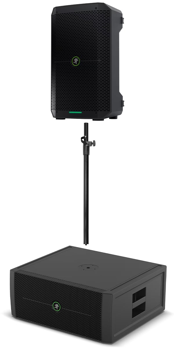 別売りのSPM400スピーカースタンド用ポールを使ってスピーカーをThumpSub GOの上に設置すれば、クリアなサウンドとパワフルな重低音を両立しながら、設置面積を抑えたオールインワンのPAシステムを構築できます。
