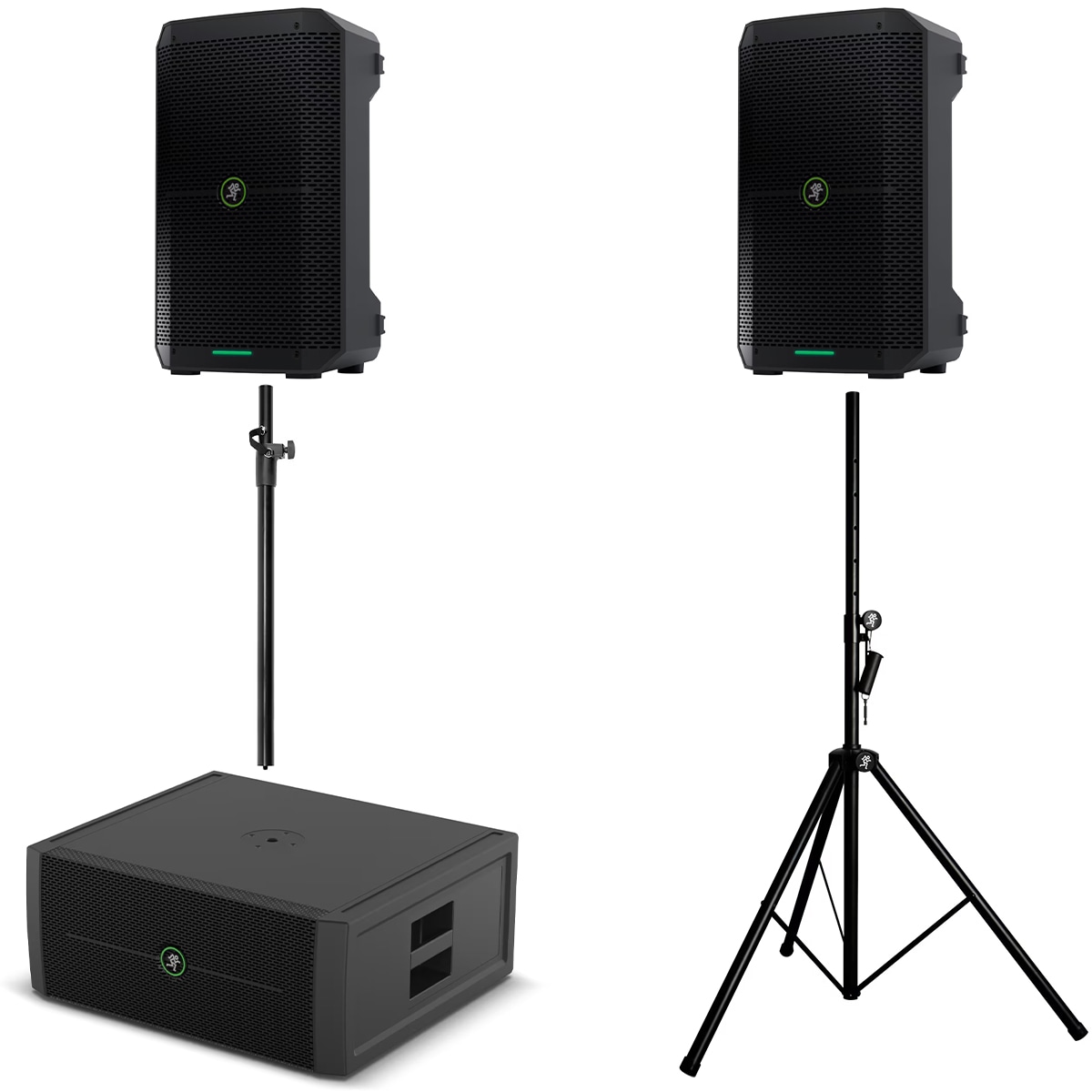 小規模クラブや盛り上がるカラオケパーティーに最適なセットアップです。ここでは、ProFX10 GOミキサーをThumpSub GOサブウーファーに直結し、さらにそのサブウーファーを2台のThump GOラウドスピーカーに接続します。