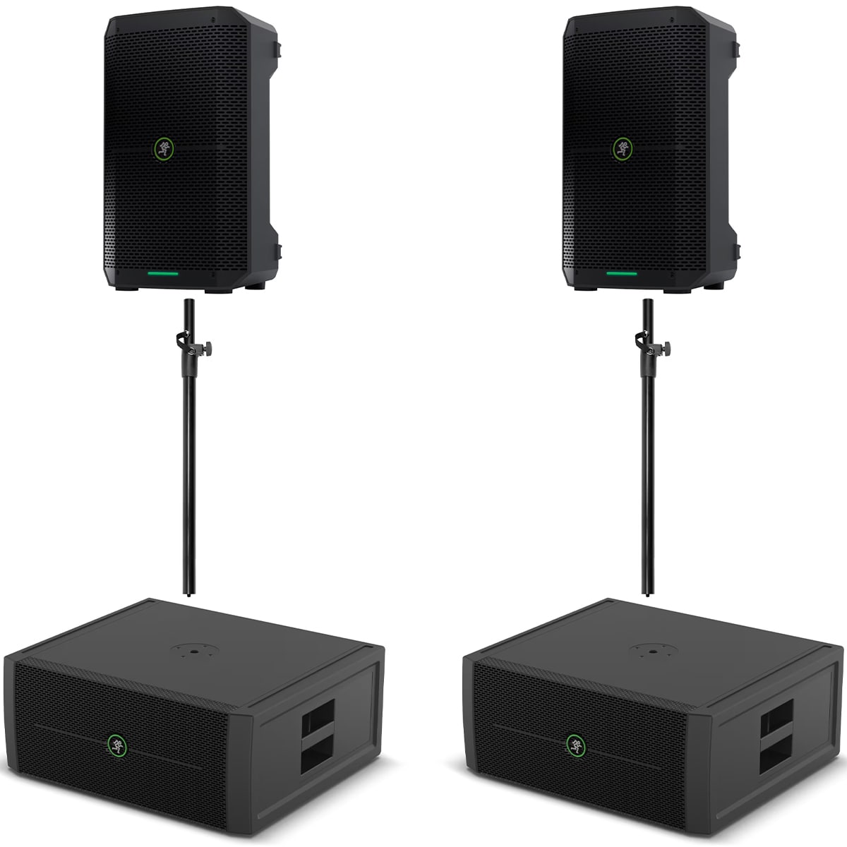 小規模クラブや盛り上がるカラオケパーティーに最適なセットアップです。ここでは、ProFX10 GOミキサーをThumpSub GOサブウーファーに直結し、さらにそのサブウーファーを2台のThump GOラウドスピーカーに接続します。