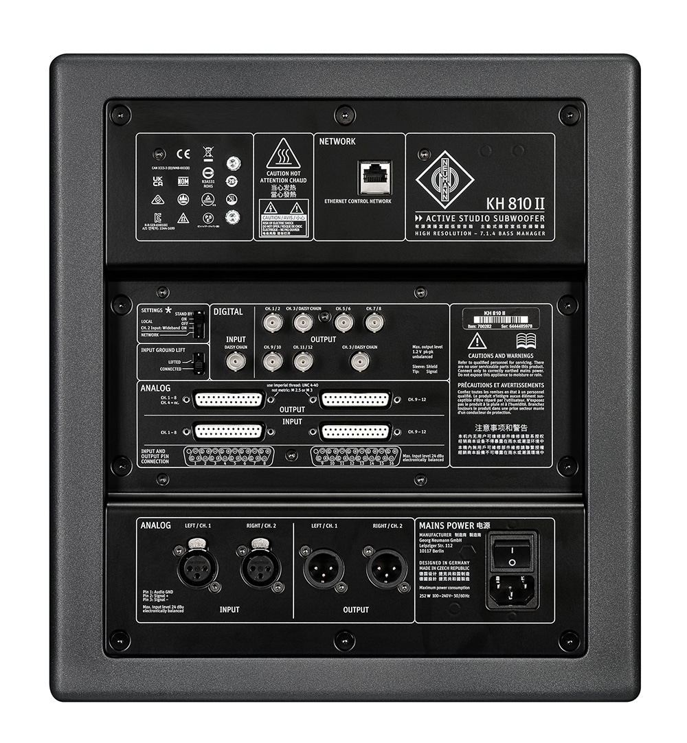 ステレオ用に、2つのアナログXLRインプットおよびアウトプットがサブウーファーへ接続できます。KH 810 IIは、マルチチャンネル用に最大12チャンネルのアナログ入力と最大11チャンネルのアナログ出力に対応する2つの D-sub 25ピンコネクタを備えています。すべての入力と出力は電子バランス方式です。このサブウーファーは、オーディオネットワーク用に AES67対応のKH 810 II AES67もラインナップしています。
