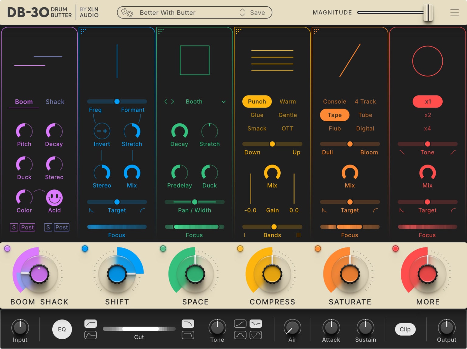 記憶に残る楽曲には、最高に響きを伴う個性溢れるドラムビートが必要不可欠です。XLN AudioのDB-30 Drum Butterは、そんな思いを手軽に実現します。あらゆるドラムループ、ドラムマシンパターン、ドラムレコーディングに使用すれば、瞬く間にビートに力強く、明確な個性を与えることができるでしょう。