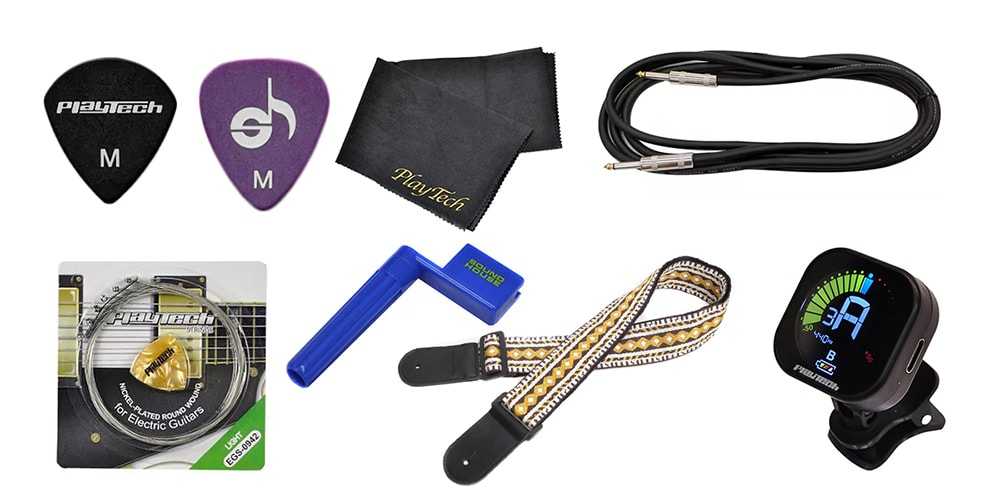 PLAYTECH(プレイテック)のお得なエレキギター用アクセサリーセット。「ギターを譲り受けたけど何から揃えていいか分からない」とお悩みの方にもぴったり!初心者におすすめのスターターセットです。ステージにも映えるジャガードストラップが付属。