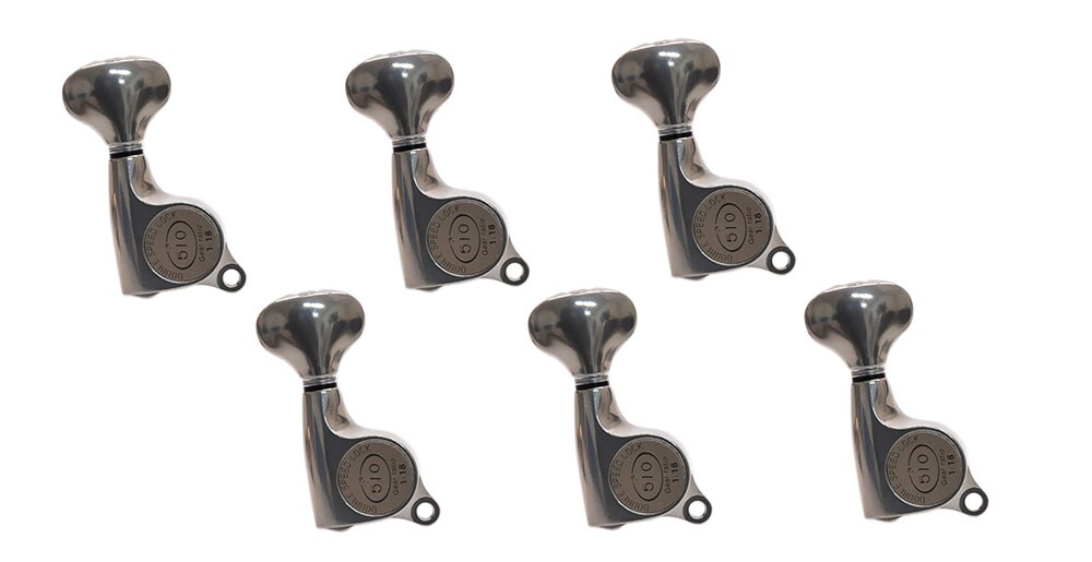 GOTOH製、ペグ配列L6連のギター用ロックペグ。弦のテンションを利用してロックがかかるマグナムロック仕様、S5ボタン、カラー:エクセレントニッケル。