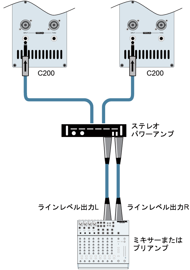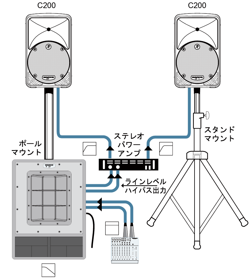 C200をMackieのサブウーファーSWA1501(またはSWA1801)と一緒に使えば、信じられないほどパワフルなシステムが完成します。サブウーファーに内蔵されているアクティブクロスオーバーがフルレンジのステレオ入力を2つの帯域に分割します。SWA1501は低域のLとRをサミングし、内蔵アンプを通して15インチウーファーで再生します。SWA1501でハイパス処理されたステレオ帯域は外部パワーアンプを通してC200に送られます。C200は図のように、SWA1501またはSWA1801の上にポールマウントして使用できます。