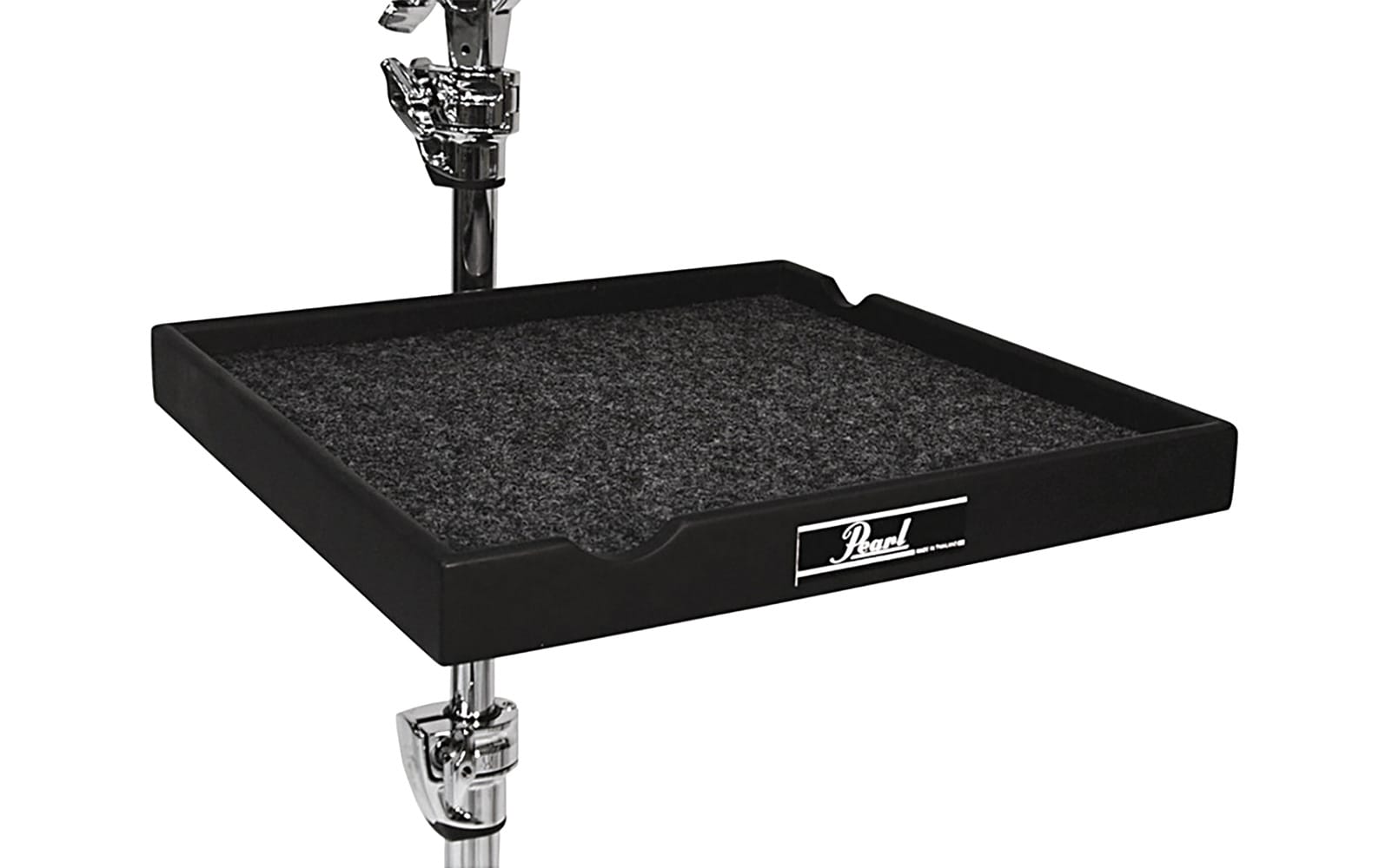 30cm x 30cmというサイズ感がちょうど良く、標準的な長さのスティックやマレットであれば、置く時に柄の部分が少しはみ出るので取りやすくなっています。カーペット生地が貼られており、スティックや楽器を置くときには衝撃を吸収してくれます。オーケストラや吹奏楽など、演奏中に物音を出さないよう配慮が必要な環境で役立ちます。付属のクランプを使用してスタンドのパイプ部に取り付けできるので、パーカッションでマルチセットを組む時など、スペースを生かしたセッティングが可能です。