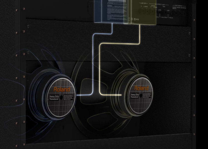 ソリッドで澄んだワイドレンジなサウンドと高い音圧、歯切れの良いレスポンスを兼ね備えた「JCクリーン」。ギターの信号を忠実に再生するその特長から、Jazz Chorusはエフェクトのポテンシャルを最大限に発揮させるアンプとしても評価されてきました。その「JCクリーン」は、2つのスピーカーにそれぞれ対応する2つのパワーアンプを搭載した、「クリーン・サウンド特化設計」によって実現されています。それぞれのスピーカーを専用のアンプで駆動することにより、各スピーカーのポテンシャルをロスなく最大限に発揮し、クリアで解像度の高いサウンドを作りだしています。信号のピュアさを保ったまま高い音圧を稼ぐことができる余裕のヘッドルームで、演奏ニュアンスにダイレクトに反応してくれます。