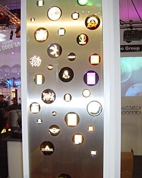 | 今回一番のヒット作!美しいネオンサインが多くの人々を集めていました。ブースの広さは6畳1間といった感じですが、いついっても人だかりが出来ていました。また各メーカーのブースでも、水晶球のようなガラス球にメーカーロゴを表示させたりと、大活躍。その正体は・・・? |