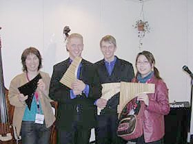 どこからともなく聴こえてきた音を頼りに進んでいくとパンフルートという楽器に出会いました。これはギリシャ神話の牧神パンが持っている笛のことで、節のところで切った竹筒を長さの順に並べた楽器のことを言います。初めてパンフルートを手にし、音は出たものの、音を出す位置を探すのが慣れないと大変です。イケ面のお兄さんにレッスンを受けながら、簡単な童謡を演奏しました♪