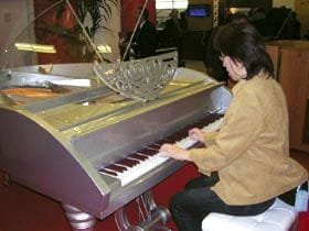 PEARL RIVERのブース銀色のピアノは、フタの部分が両側に開くので、第一印象はまさにチョウチョ。どこかへ飛んで行ってしまいそうな夢いっぱいのピアノです。また黒鍵が黒ではなく、あずき色など、すごくゴージャスな雰囲気を醸し出しており、見ているだけで優雅な気持ちになりました。