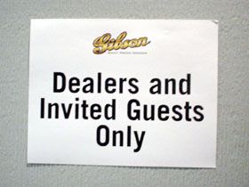 やっぱりギターはGIBSONでしょ!とGIBSONのブースに行くと、入り口に張り紙が、、、。誰でも入れるというわけではないようですが、なにがなんでもレポートするぞ!という決死の覚悟で突入し、いざ交渉!