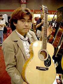 LARRIVEEの新型パーラーギターを試奏。後で談笑しているのは誰あろうJeanLarrivee氏! 小柄で気さくなおじいさんといった感じでした。カナダ製のLARRIVEEもカリフォルニア工場が稼動し、新シリーズを展開しています。