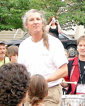 NAMM Summer Sessionのフィナーレは、恒例のドラムセッションです。毎回最後に自由参加でドラムやパーカッションが貸し出され、1時間以上も演奏が続きます。今回はリチャード・ギア似?! のコンダクターを中心に日が沈むまで熱いセッションが繰り広げられました。