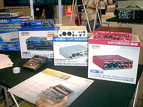 Rolandのブースでは、最新のi MacにセットされたEDIROLのMIDIコントローラーPCR-M30などを展示。後ろの大画面でDTMソフトの画面が連動して映し出されていました。